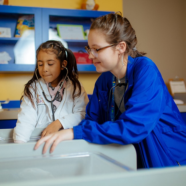 Child wearing a stethoscope and lab coat with an adult adn both are standing over an off camera subject